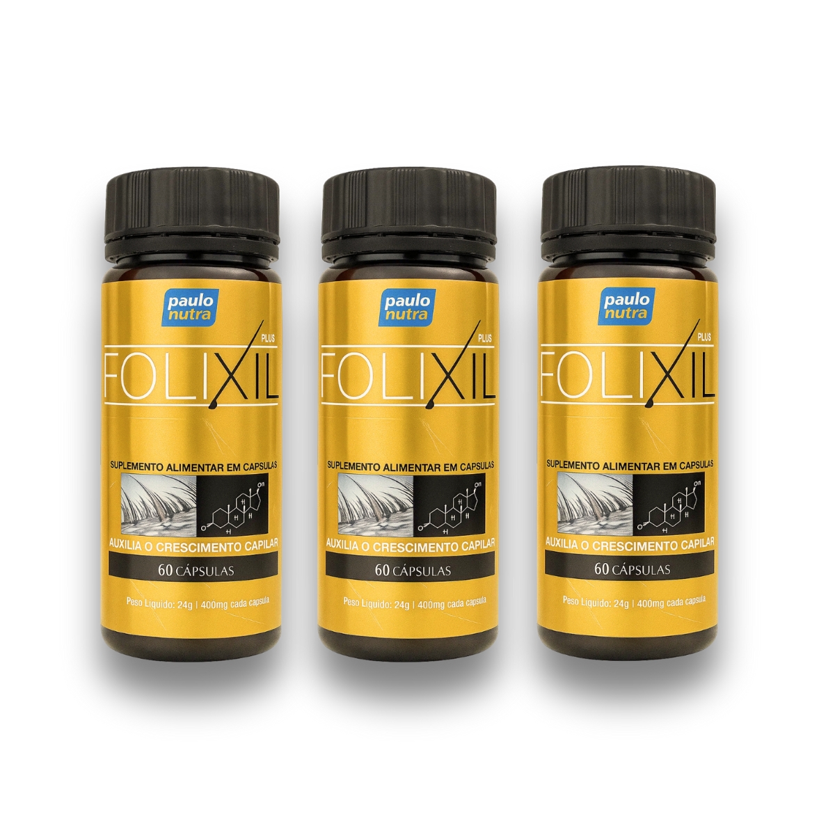 Folixil é um suplemento capilar desenvolvido com uma fórmula avançada e natural, rico em vitaminas e minerais essenciais para a saúde e crescimento do cabelo, além de contribuir para a regeneração da pele e fortalecimento das unhas. A fórmula contém colágeno hidrolisado, vitaminas A, C e E, além de minerais como zinco, cromo e selênio, que agem no bulbo capilar para nutrir e fortalecer os fios de dentro para fora.