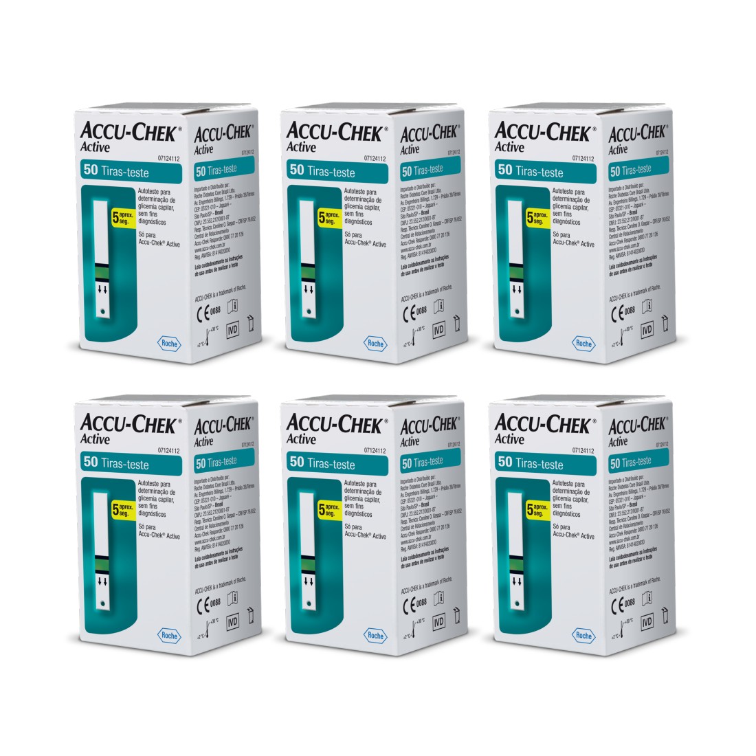 Embalagens com tiras e chip de código, para a determinação de glicemia e próprio para automonitorização. Esta tira é compatível somente com o aparelho Accu-Chek Active que tem as seguintes características: